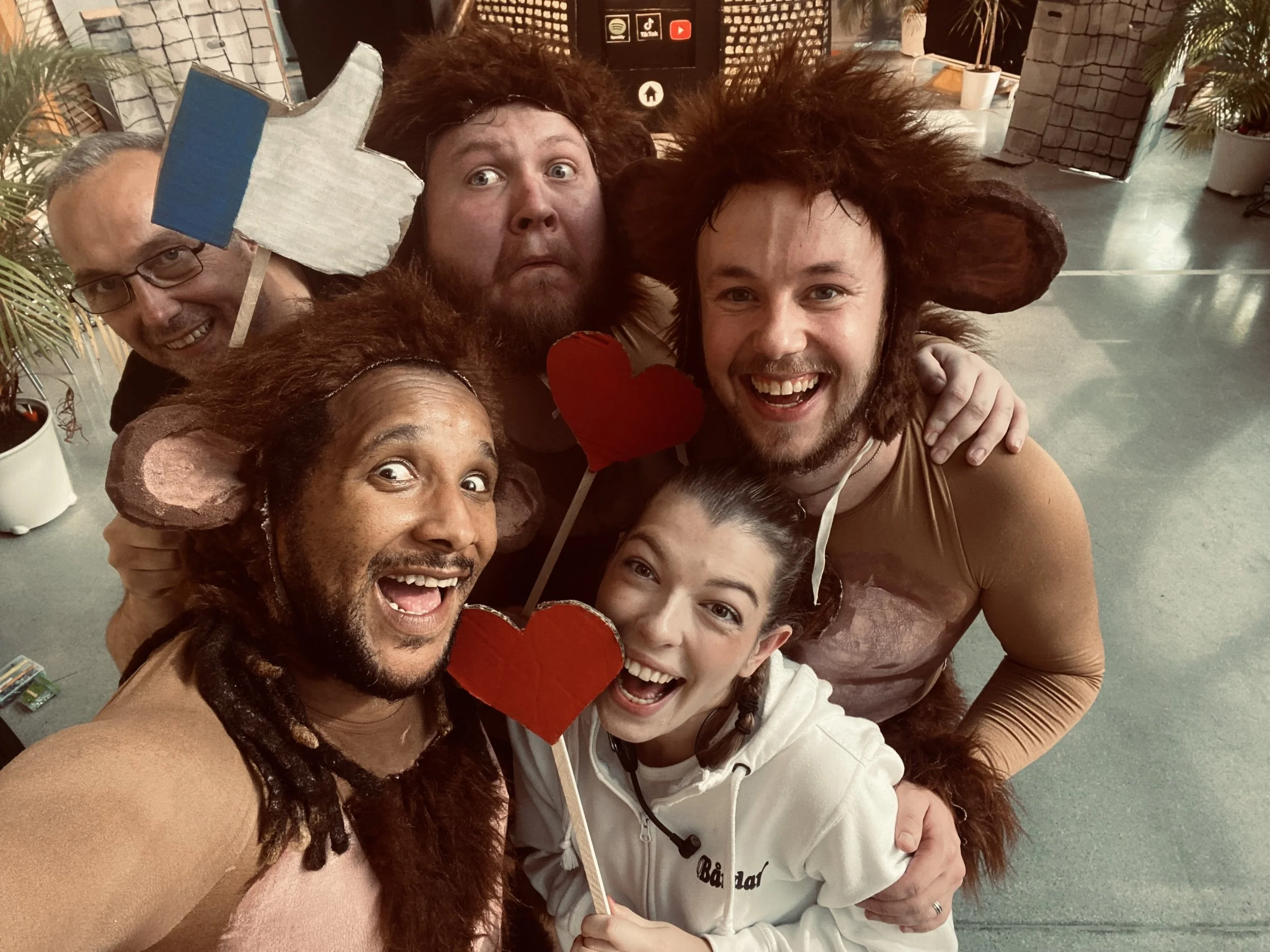 Som skuespillere har vi 5 tilsammen utallige opptredener i de mest populære barneteater forestillingene i Bergen. Der i blant - Jungelboken, Brødrene Løvehjerte, Ulverock, Trollala og Hakkebakkeskogen. Velkjente Stig van Eijk har skrevet og opptrer selv med barneforestillingene “Trollala og julen som forsvant” og “Det var en gang”. Arild Brakstad er opphavsmann til nyskapninger som black metal musikalen “Svartediket” og science-operaen “Fish to Mars”. Vi har nå uformelt dannet et teaterkompani som satser på eget nyskrevet materiale og musikk. Vår første produksjon er hentet fra barns eget gjenkjennelige forhold til spill, mobil og databruk og er kalt “Mobilen”. Forestillingen har premiere på Helgeseter barnefestival 27.september.